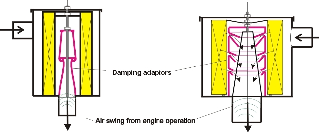 Damping adaptor of air filter for IC engines There is a way to increase the efficiency of air filters! This is the application of the damping adapter the "deaf filter". The deaf filter reduces the swings originating from the engine operation, and increases filter performance at the same time. The deaf filter can be installed mostly inside the normal air filter cartridge. The evaluation of engine wear and instrumental anaysis of used engine oil samples draw the attention to the fact that dust can drift through most of the applied air filters independent of their make. The cause of dust migration is the swing originating from the engine, which according to investigations can very frequently appear at the clean side of the filter. In case of turbocharged engines the swings are generated under lower load and engine brake working conditions. The damping of swings before the air filter proved to be the most effective solution to this problem. The adapter is especially effective in air filters installed directly onto the carburettor. The working priciple of the damping adaptor Some finished adaptors